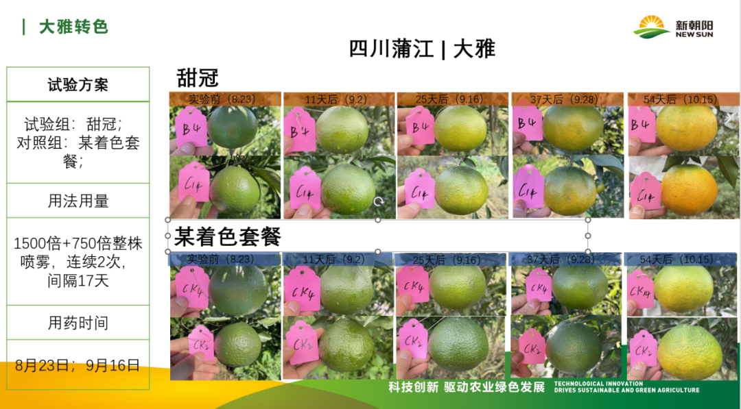 甜冠(冠菌素)適用于各類柑橘品種,如愛媛、金秋砂糖橘、砂糖橘、冰糖橙、金桔、沃柑、耙耙柑、不知火等。促進(jìn)果實轉(zhuǎn)色、顏色紅潤,表皮靚麗,提升干物質(zhì)積累,如提升糖度、芳香味物質(zhì)積累,提高果實品質(zhì),提前上市,提升抗逆性,延長果實留樹保鮮和果實貨架期,減少流通環(huán)節(jié)損耗。
